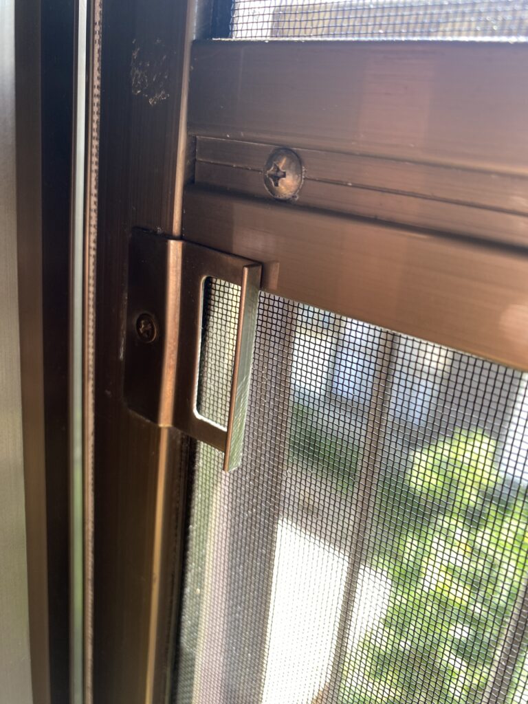 網戸の内側に金属製の握りがついているのも特徴。この握りが歪んできるとガラス窓に干渉するので注意が必要です