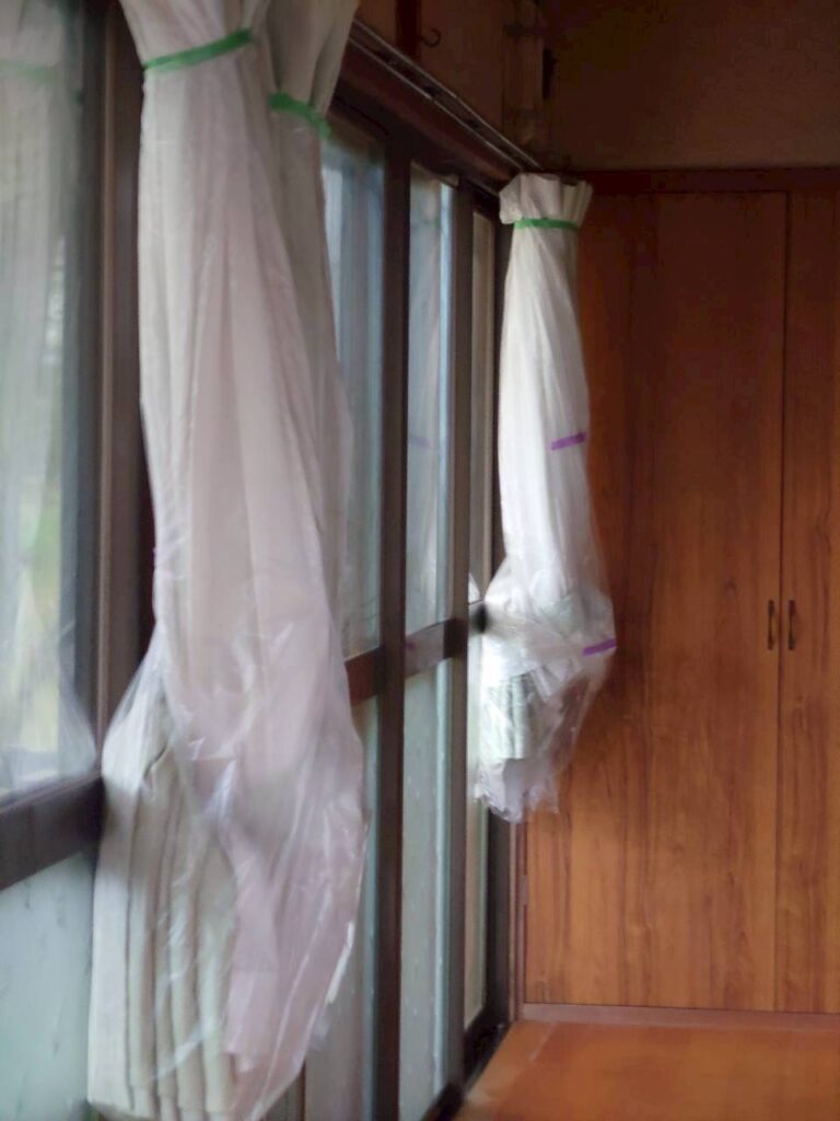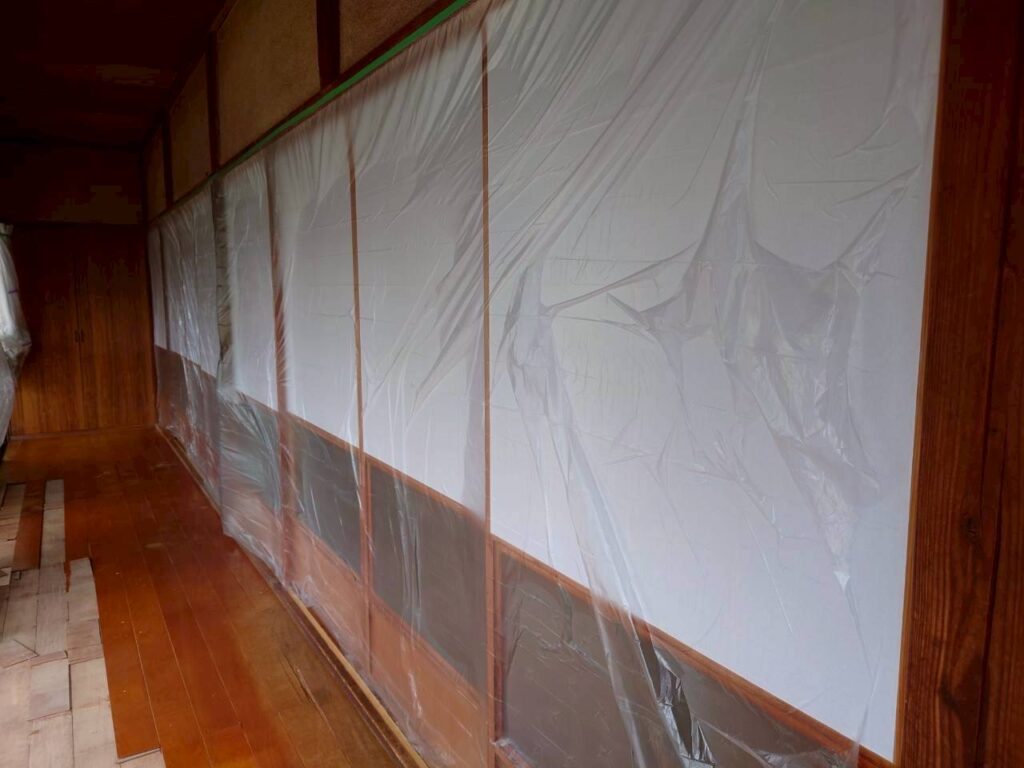 今回はその補修工事の様子をご紹介します。障子のすぐ近くということで、作業中にホコリや傷が付かないよう、まずはしっかりと養生を行いました。