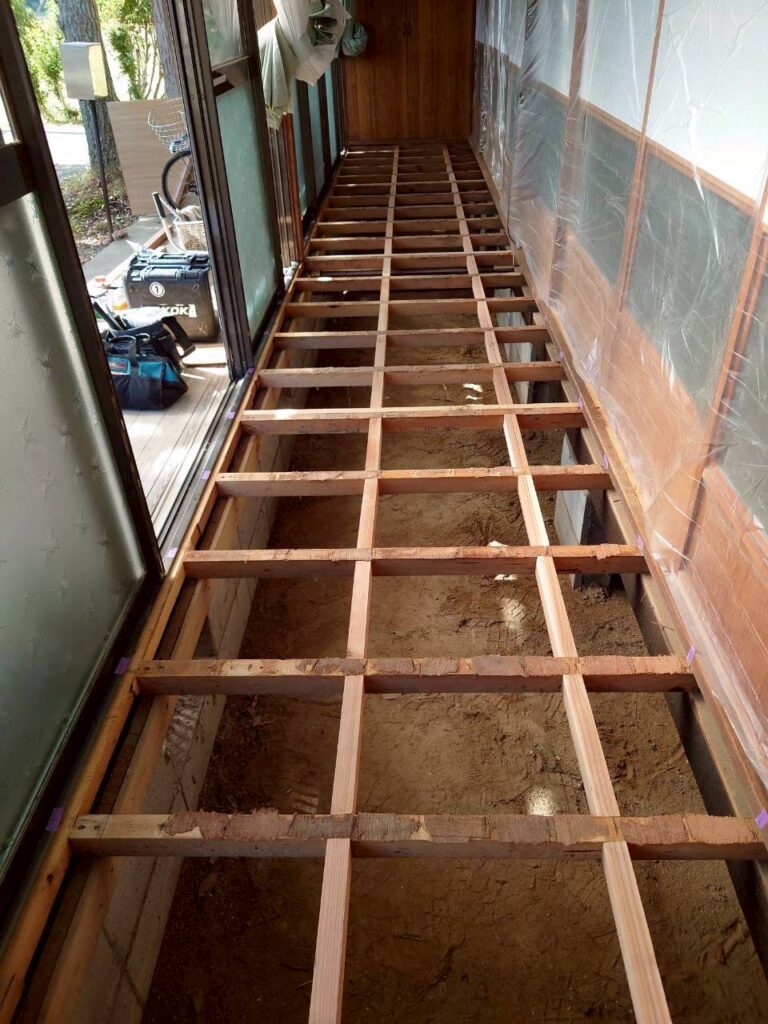 古い家屋の縁側で「床が沈む」「歩くとギシギシ音がする」といったご相談をいただきました。