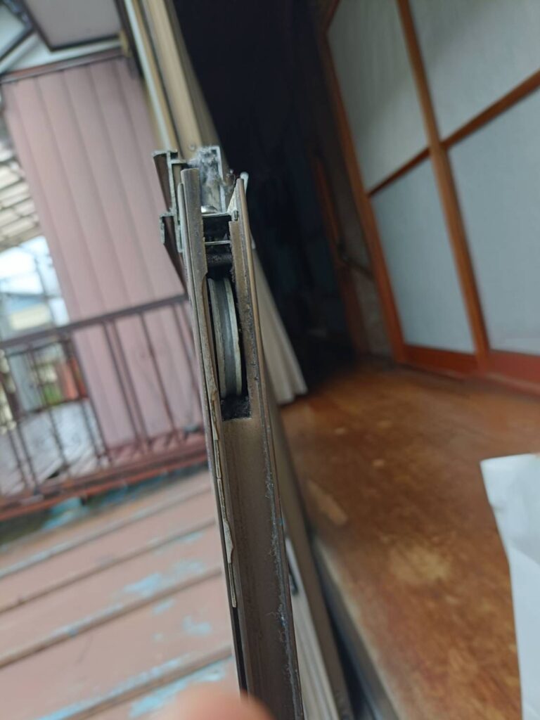 現地を確認すると、**サッシ下部の滑車(戸車)**がすり減り、高さが足りずガラス本体とレールが直接こすれている状態。
