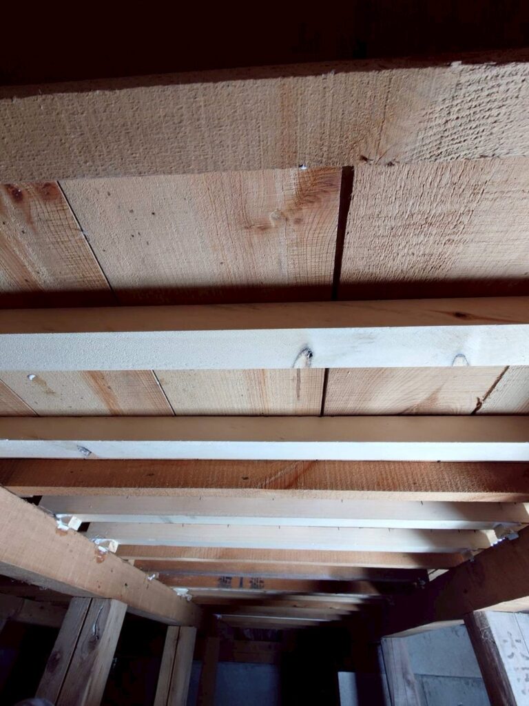 床を支える骨組みである根太を新たに数本増設し、既存の根太との間隔を詰めて強度を高めました。