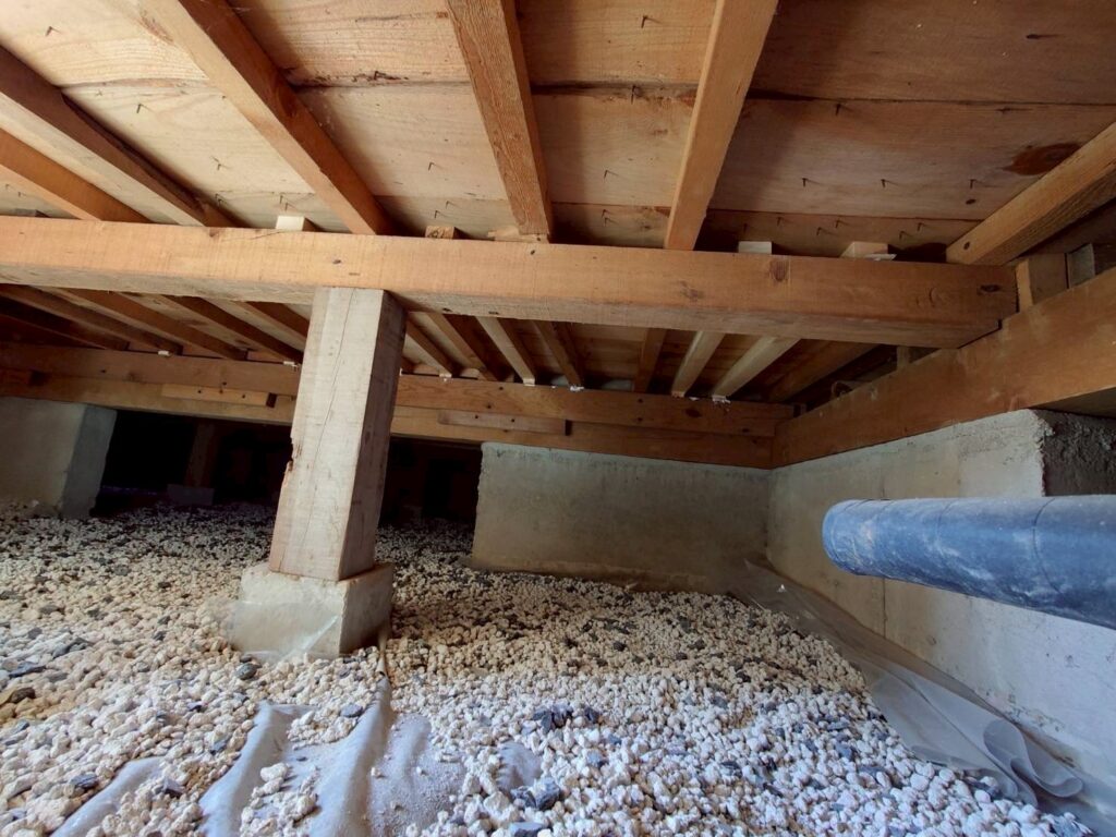 床下を覗くと、幸いにも大引(おおびき)と束(つか)はしっかりしており無事でした。