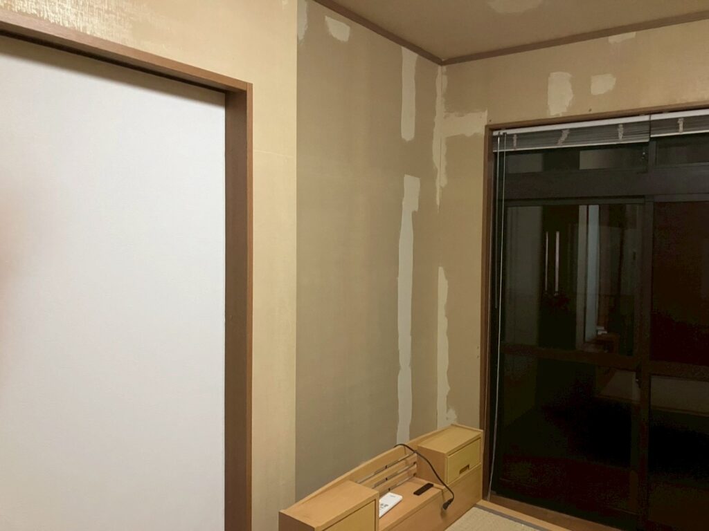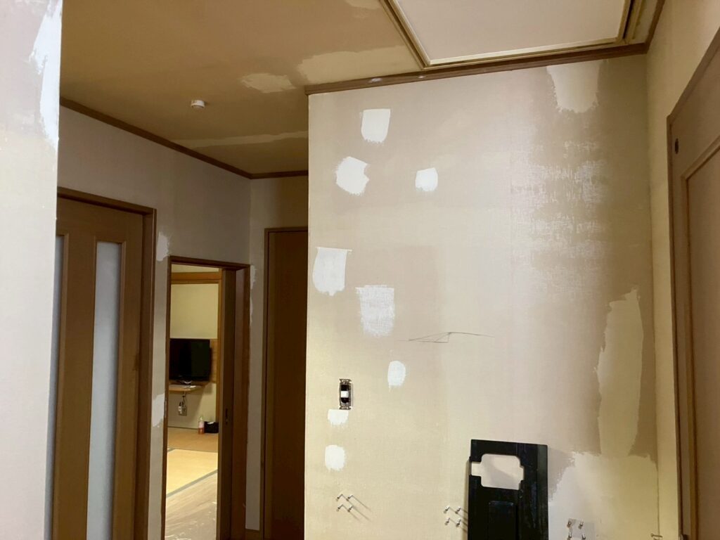下地は浮き・割れ・穴のみ補修。全面パテはしない。継ぎ目は目線高さを優先し、奥壁で逃がす。既存クロスが薄色なら同系色・量産番で透けリスクを回避。糊付けは現地糊付け機で一括、余尺管理は部屋単位。