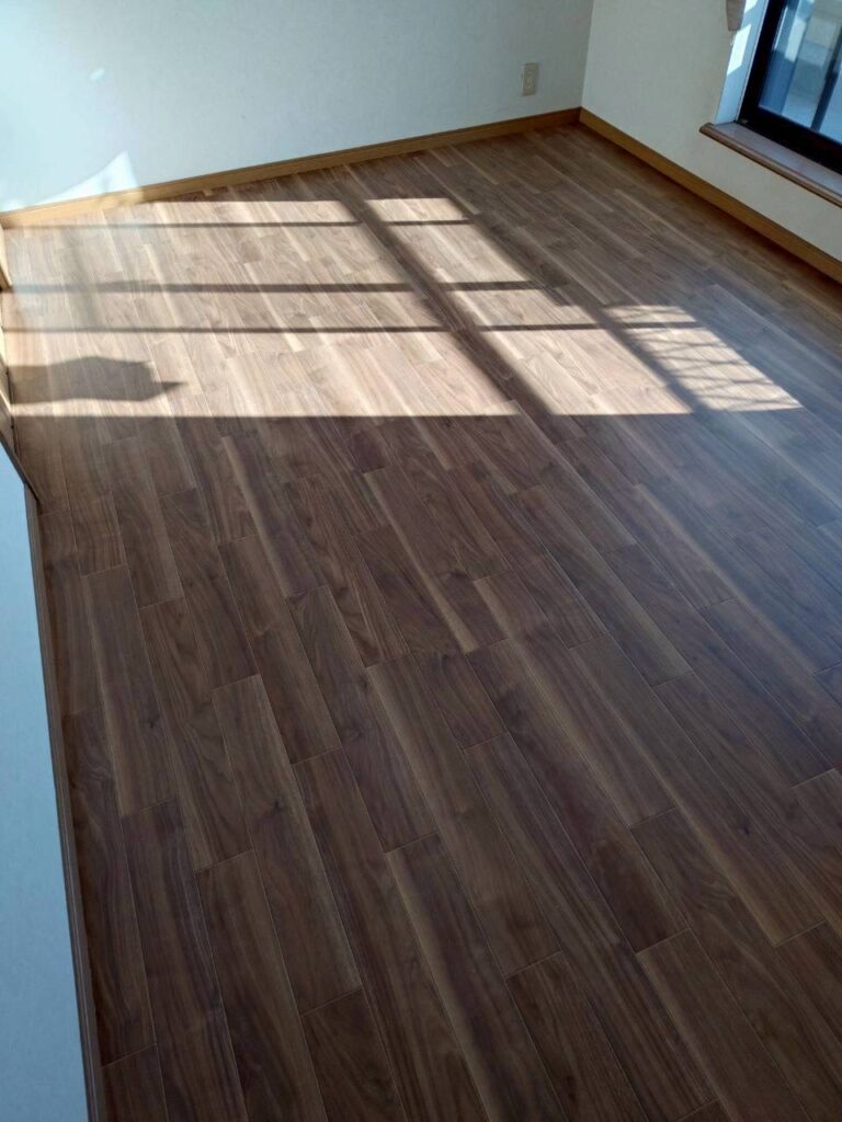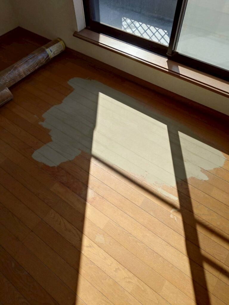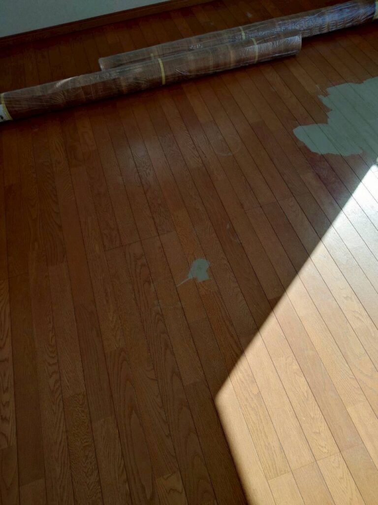 フローリングの凸凹はパテ補修してから貼り付け