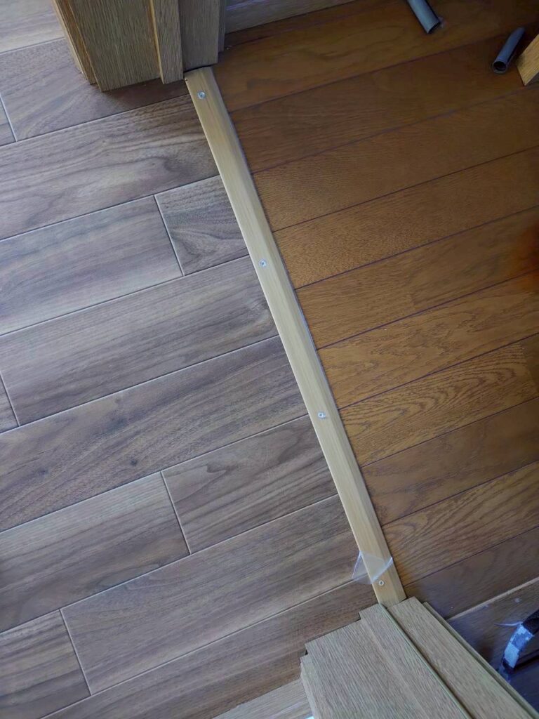 廊下と洋室の境部分はCFを張った洋室側と、現状ままの廊下側フローリングとで2ミリ弱の高低差ができるため、段差を緩和する見切り材を取り付け