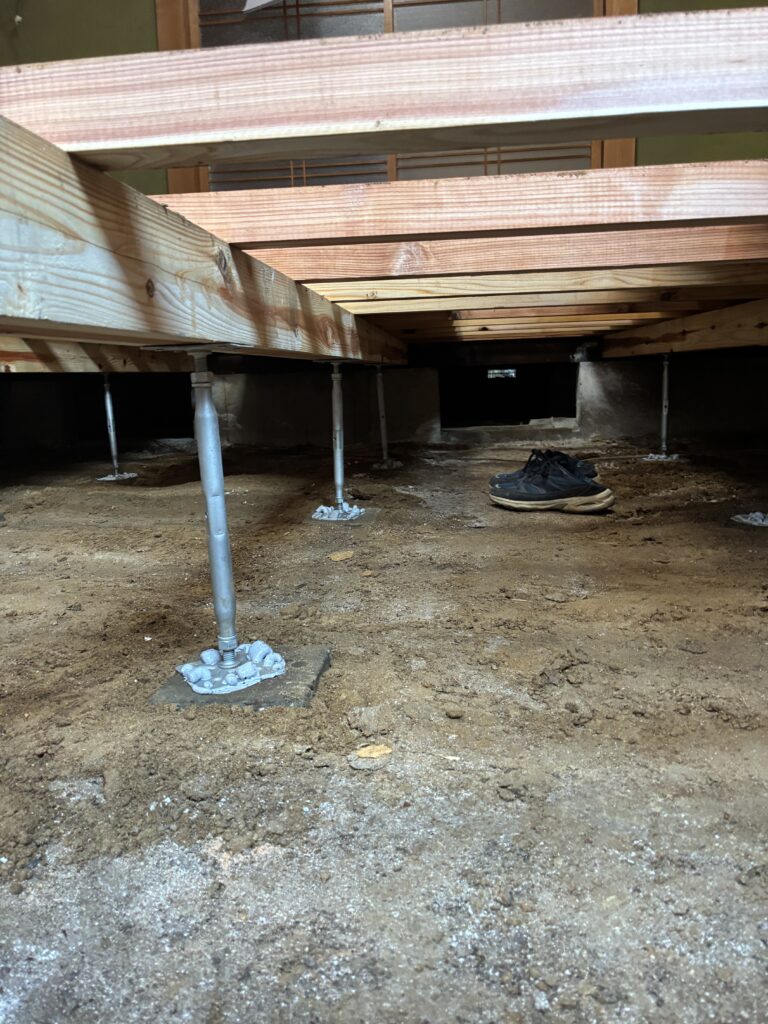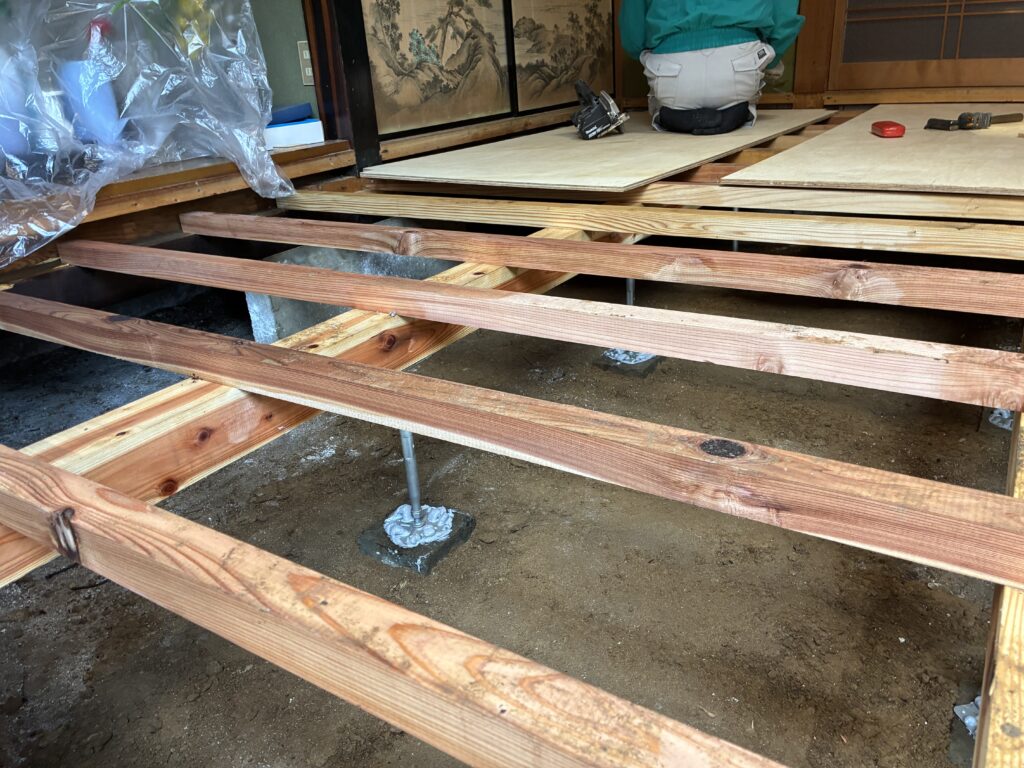 今回、束(床を支える縦の支柱)も木製から金属製へ交換しました。