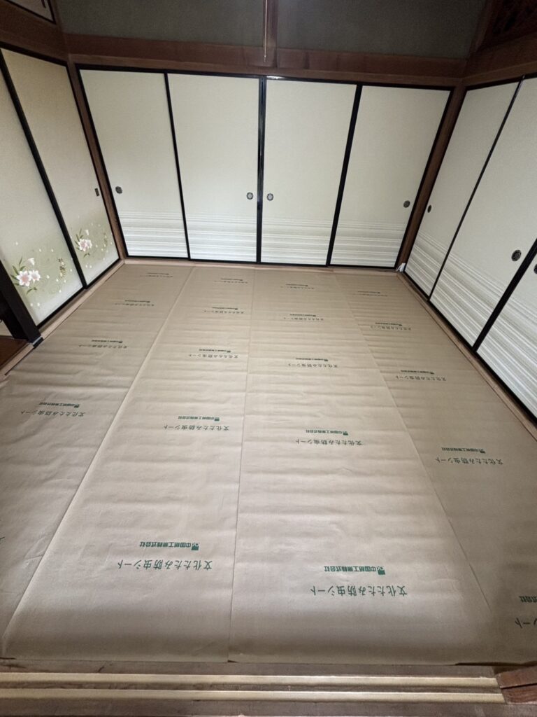 今回は和紙畳を選択。い草に比べて耐久性が高く、色変化が少ないのが特徴。ペットや日当たりの強い部屋には相性が良い。見た目の自然さは天然い草に軍配が上がるが、生活環境によっては和紙の方が合理的。このあたりは好みではなく、使い方ベースで判断するのが基本。加えて防虫シートを施工。畳は構造上、どうしても湿気と隣り合わせになるため、防虫対策は後からではなく施工時に入れておくのが効率的。コストも限定的で、後悔の出にくいポイント。