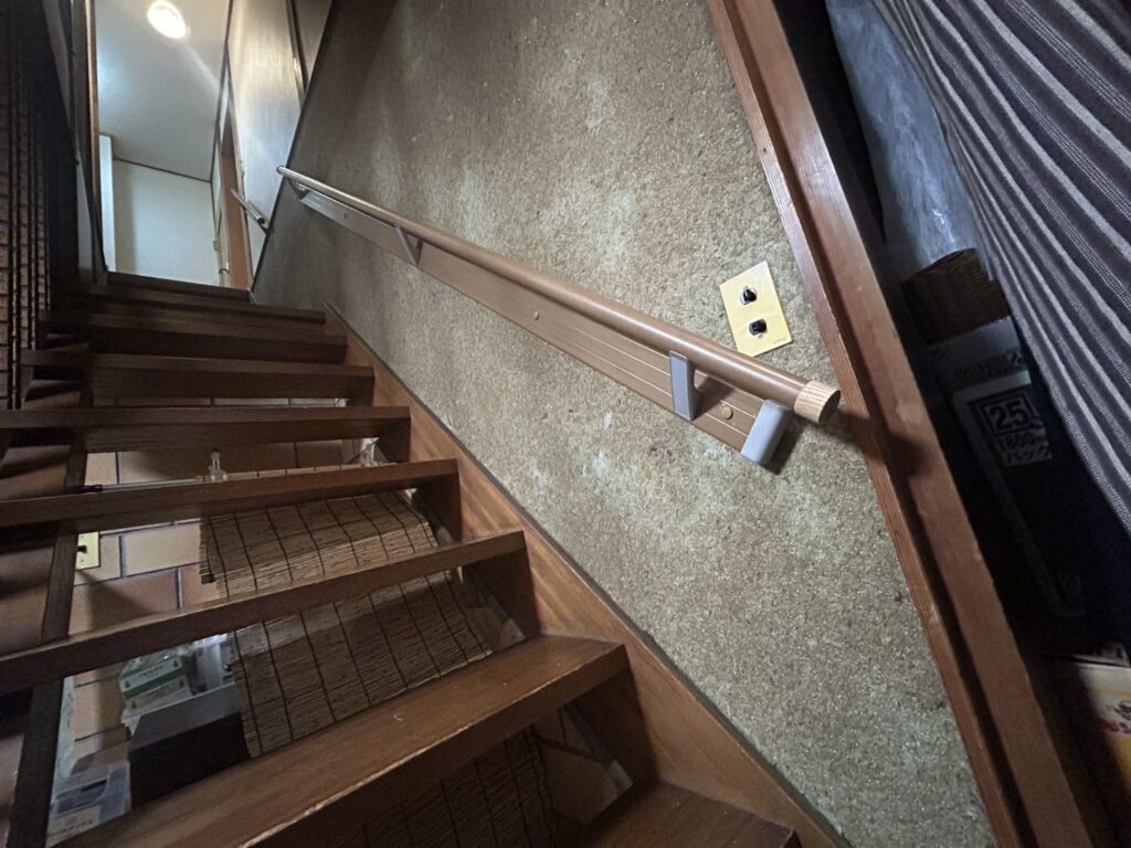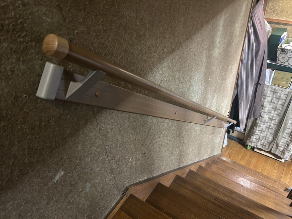 今回の施工では、まず既存の砂壁の状態を確認し、間柱や胴縁などの下地位置を特定。その上で、直接固定が難しい箇所についてはベース板(補強板)を設置し、荷重を分散させる構造を採用しました。砂壁表面を一部処理し、下地にしっかり効かせたうえでベース板を固定し、その上から手すり本体を取り付けています。これにより、引っ張り・体重支持の両方に耐えられる強度を確保しています。